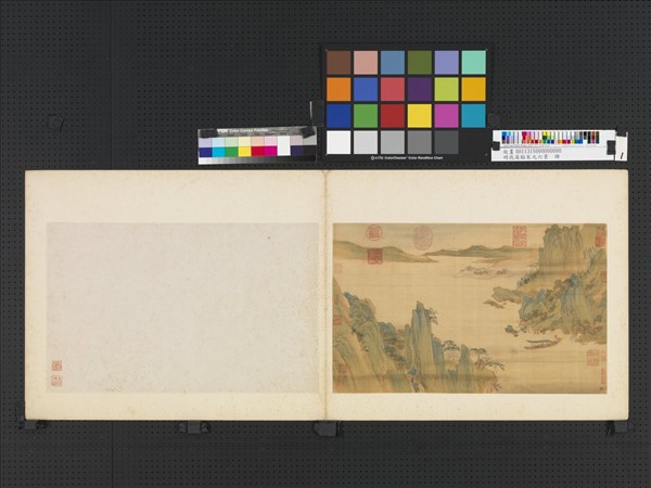 仇英(約西元一四九四-一五五二年),江蘇太倉人。字實父,號十洲。年輕時曾為漆工,後遇周臣,經其指授,漸有名於藝壇。 本幅為「臨宋元六景」冊第一幅。峰高湖闊,泛舟其間,無限徜徉。按仇英曾受聘於大收藏家項元汴,臨摹古畫頗有心得。此冊精麗中,又有一份瀟灑,為其本色。幅上有項氏收藏印,可能即受聘項家時所作。