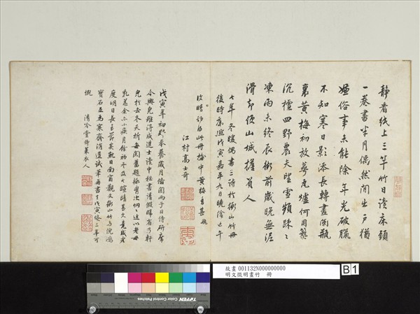 文徵明(西元一四七○-一五五九年),江蘇長洲人。初名壁,字徵明,後以字行,亦字徵仲,別號停雲生。詩文書畫俱佳,畫師沈周,為明四大家之一。   本冊乃文徵明於嘉靖戊戌(一五三八)年為王穀祥作。畫中之竹有風、雨、晴之姿,以雙鉤及墨筆繪成,用筆穩健,墨法乾濕互用,變化繁多。又觀跋中語,似是授徒稿之類,故於飄逸清妍之墨趣中,仍具規矩準繩。
