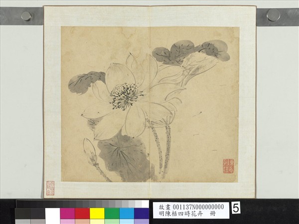 陳栝(約活動於十六世紀中葉),江蘇長洲人。字子正,陳淳子,號沱江。為人放誕不羈,嗜好飲酒,有竹林七賢遺風。畫以花卉見長,有乃父之風,筆勢飛勁,水墨淋漓,尤以梅花最為人所稱道。  本幅選自「四時花卉」冊第五幅。通冊描畫花卉十種,皆筆墨簡率。此幅所繪盛放的墨荷,亦行筆簡略。花瓣、葉筋並未筆筆交待,然荷之粉光嬌態,酣酣欲醉之狀足矣。