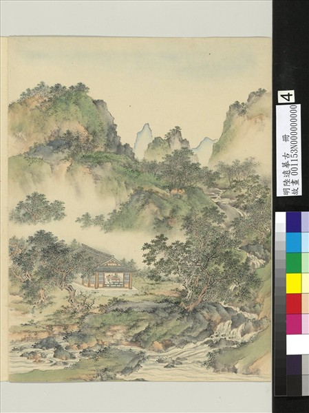 陸遠(活動於十七世紀中葉),生卒年待考,字靜致。畫史上出現過兩位陸遠,俱明末清初人士。依本冊末幅陸遠款題下,鈐印「靜致」而定。陸遠善畫山水,宗法米氏。此冊山水共十幅,俱為陸遠個人之畫集。雖在筆意上,追仿宋元名家,但於構圖、敷彩上,皆表現出清朗秀麗之個人特色。此為第四幅。峰嵐飛泉、平坡敞軒,士人憑欄聽泉,一派悠閒。構圖細謹,尤以流泉層層迴瀉而下,更增加了佈局的別致。青綠與水墨交融,夏日蒼翠,景色生動。