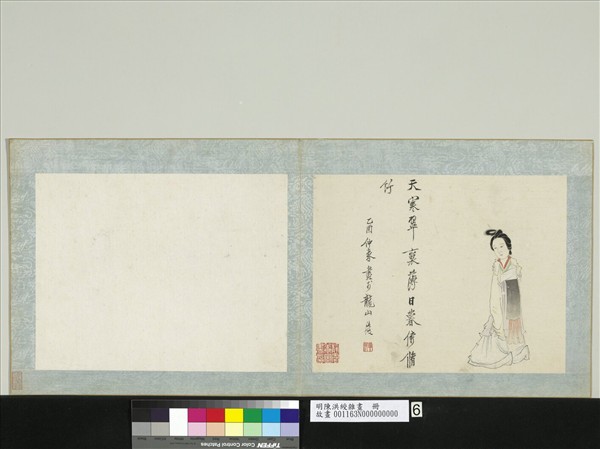 陳洪綬(西元一五九八至一六五二年),浙江諸暨人。字章侯,早年自號蓮沙彌,後號老蓮。明亡後,又號悔遲、勿遲。人物、花鳥、草蟲、山水無不精妙,皆能自出機杼,表現出高古奇駭,意趣盎然之特色。為晚明極具影響力之大畫家。  設色畫仕女,衣着樸質,着色雅澹,畫衣紋用筆蒼勁穩健,強調轉折起頓,線條由方直而入圓勁。意境入於神化,是老蓮精心之作。  本幅選自陳洪綬「雜畫」冊第六開。