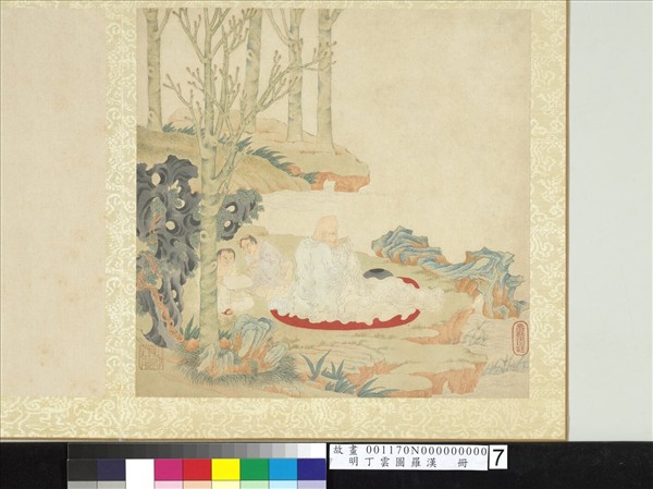 丁雲圖,生平不詳,但觀其作品無論構圖、筆墨皆與丁雲鵬(西元一五四七或一五四八年生,一六二八尚在)早年畫風相似,故疑為同一人。  此圖為「羅漢冊」之一開。畫羅漢坐於野外補衲,二侍者展卷閱讀,似有心得之狀。人物線描如行雲流水,造形則作變形處理。全筆法纖細,佈局工整,設色淡雅,兼用青綠,頗有吳派風韻。此冊有丁丑至戊寅圖成之題識,故知本幅畫於西元一五七七至一五七八年之間。