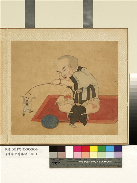 大頭娃娃模樣怪, 長長眼睛粗粗眉, 青色頭皮耳朵大。 盤起腿來戲傀儡, 小小傀儡造型俏, 搖頭擺尾蹦蹦跳。 陳字(一六三四年至?),陳洪綬子,書畫綽有父風。畫嬰兒盤坐氈上,左手持弄懸絲鍾馗。鍾馗手足飛舞,滑稽可愛,嬰兒造型碩額大耳,畫來頗有乃父誇張變形手法。