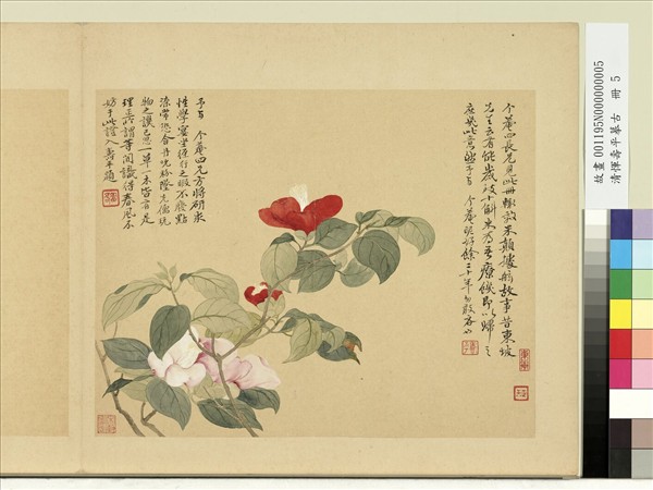 惲壽平(1633-1690),師北宋徐崇嗣(10世紀後半)沒骨法,又據己意寫生,為清代花卉宗師。 繪單瓣野生種茶花,花大而艷麗。山茶每於冬至、初春季節轉換間開花,花色繁複。枝葉沒骨寫之,以汁綠點畫,並以較深色澤鉤畫筋脈輪廓。花卉形象自然生動,賦色明麗,筆法沉穩,格調古雅。據其題跋「予與个菴四兄,方將研求性學。宴坐經行之暇,不廢點染。常恐含丹吮粉,墜先儒玩物之譏。己思一草一木,皆有是理。」所謂是好友相聚,人閒花好。本幅選自<清惲壽平摹古冊>。(20110102)