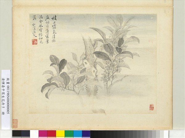 惲壽平(1633-1690),原名格,字壽平,後以字行,江蘇武進人。初善作山水,因自謙無力與王翬(1632-1717)爭勝,遂改工花卉。畫法承自徐崇嗣(10世紀後半)之沒骨法,又參以己意,風格獨創,蔚為清代花卉畫宗師。   本幅選自<寫生花卉冊>。霧氣中出現桂花枝幹,底色淡染花青,以表現夜景。桂花盛開於秋季,幅上又自題「枝上霜氣清。」顯是畫秋夜霜降時景緻,於構景中不但表現季節性,也兼有情境感的呈現。 (20110102)
