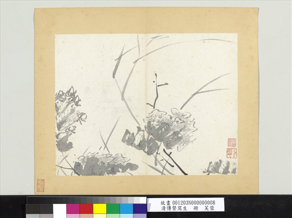 朱耷(西元一六二六至一七0五年),為明朝皇室後裔,世居江西南昌。明亡,出家為僧。擅長山水、花鳥、蟲魚、木、石。他的畫純出靈性,不循古法,簡化造型,筆墨縱恣,而能攝取無限生機。朱耷別號頗多,「傳綮」為早年法號,「八大山人」為還俗後的別號,最為人知。 朱耷「寫生冊」年款己亥,是年三十四歲,屬早期的作品。本幅以「芙蓉」為題,筆法疾速,構圖奇詭,形簡而意足。筆墨間,頗有陳淳(一四八三-一五四四)的遺意。
