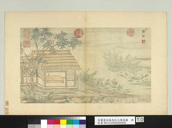 蕭雲從(西元一五九六-一六七三年),安徽蕪湖人。字尺木,號默思,別號無悶道人,晚稱鍾山老人。明崇禎九年副貢,入清後不仕。精六書、六律、工詩文,善山水,兼長人物,得倪黃筆法,晚年自成一家。生平所畫太平山水圖、離騷圖,好事者鏤板以傳。   樹下一茆屋,屋中一榻,榻上人倚枕托腮而臥。屋外水塘,荷花正開,清風微揚,蘆草荷蓋隨之擺動。通幅用筆如螞蝗蠕動,蓋學宋人馬和之。   本幅選自「臨馬和之陳風圖」第十開。