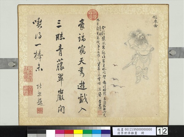 李世倬(?—一七七○),奉天(遼寧瀋陽)人,一作三韓(內蒙)人。字天章,號穀齋,又號菉園,別號清在居士。為高其佩(一六七二-一七三四)外甥,官至復都御史。 本幅選自「李世倬雜畫冊」第十二開。白描畫鍾馗執劍獨立,旁有蝙蝠五。因「蝠」字與「福」發音相同。畫蝙蝠飛翔於空中,儼然有「福自天申」的涵義。若再與「執劍」二字的諧音「只見」相結,更成為「只見福來」的吉祥語。是以明、清畫家每畫鍾馗,多喜附以蝙蝠。