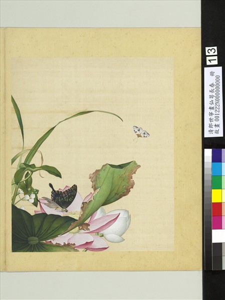 郎世寧(西元一六八八-一七六六年),意大利人。十九歲時,入天主教耶穌會為修士。曾學西畫,兼習建築。二十七歲來華,以繪事供奉內廷。歷仕康、雍、乾三朝。善畫人物花鳥,尤善犬馬。本幅選自「畫仙萼長春」冊第十三幅,粉妝荷花隨風輕漾,與慈姑相依相伴,益顯盈盈。花蝶翩翩飛舞其間,憑添清新涼意。畫家兼融中西畫法,在西洋光影透視以及西畫顏料運用下,景物細緻逼真,色彩穠艷。