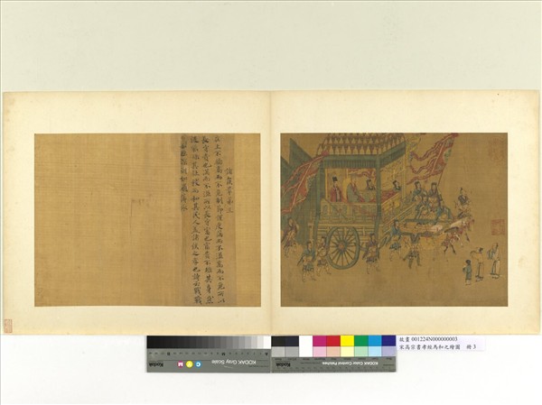 《孝經》為宣揚孝道和孝治思想的儒家經典,此圖冊將孝親推廣至立身、事君,由不同階層角度,來描繪孝道的表現。原書畫本為手卷,後改裝成冊。冊後有宋逢丑及趙孟頫諸跋,皆肯定書法出於高宗。元夏元彥嘗云:「高宗每書毛詩三百篇,令和之圖寫」,故後人多將此類教化題材歸於馬和之所作。然細審其畫風,則近似南宋院畫家李唐、蕭照等人。本件選自第五幅。