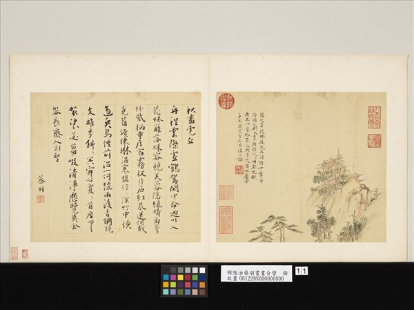 陸治(西元一四九六-一五七六年),江蘇蘇州人。字叔平,住在包山,因號包山子。以孝友著稱,好為詩及古文辭,善行楷,尤通繪事,遊祝允明、文徵明之門。其於繪畫,力求出奇致勝。工寫生,點染花鳥竹石亦頗能傳神,是明代有名的畫家。   此冊款署己亥(西元一五三九年),陸治四十四歲,為蔡羽送陳啟之詩配圖,雖云記實之作,卻出以疏放筆調,似不經意,意趣重於形似,文人抒情,往往如此。   選展二開,為「陸治蔡羽書畫合璧」冊第十、十一開。