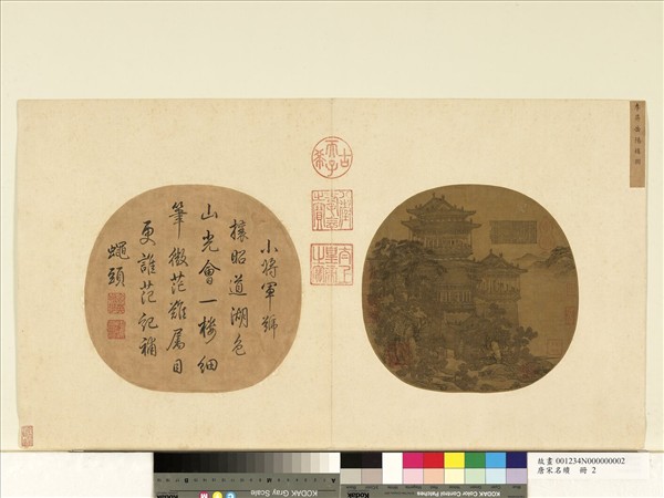 岳陽樓位於湖南岳陽縣西門,北宋滕子京謫守巴陵郡重修此樓,並請范仲淹作記,其中「先憂後樂」名句傳世,使之聲名大噪。觀景樓閣矗立於城墩上,樓外洞庭湖面寬廣浩渺。畫上無款印,舊簽題李昇為唐末入蜀畫家,應不致見此文。細察樹石繪法、殿宇結構,與北京故宮夏永「岳陽樓圖」相似。夏永(西元十四世紀中葉)字明遠,浙江錢塘人。存世畫蹟多為團扇、冊頁,畫上常自題與建築相關的詩詞。