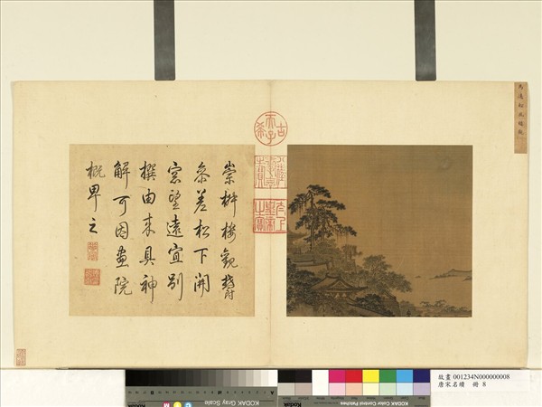 邊角構圖繪園林中屋宇重疊,園外隔岸遠山。建築群結構描繪仔細且等級高,似為宮苑,可能反映南宋宮苑依山建築情景。款題馬遠,其用筆結字,與〈山徑春行〉、〈雪灘雙鷺〉等簽款皆不類,應非出自馬遠。 畫風受馬遠風格影響,小幅畫面繪宮苑一隅作法,接近上海博物館藏〈臺榭月夜〉,細緻度則未及,由此來看,本幅或許反映了宮廷外其他畫家模仿畫院名家風格的現象。(20101015)