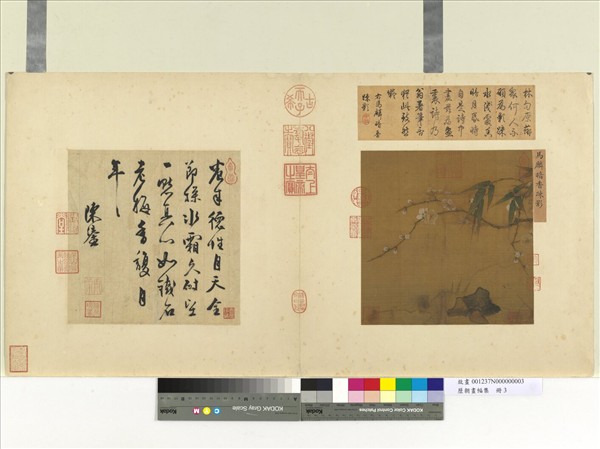 本幅無款,舊籤題標名馬麟暗香踈影。畫中白梅花萼染石綠、胭脂,符合范成大(1126-1193)《梅譜》「綠萼梅」所述「吳下又有一種,萼亦微綠,四邊猶淺絳,亦自難得。」畫面融合北宋詩人林逋(968-1028)「疏影橫斜水清淺,暗香浮動月黃昏」詩意。攲斜梅枝與稀疏竹影掩映,自右向左斜出,轉折角度細膩優雅,背景空無一物。水面倒映梅枝與竹葉,亦隱約可見白色花苞與綠色花萼。不畫月卻表現月下梅影,份外清雅。(20101015)