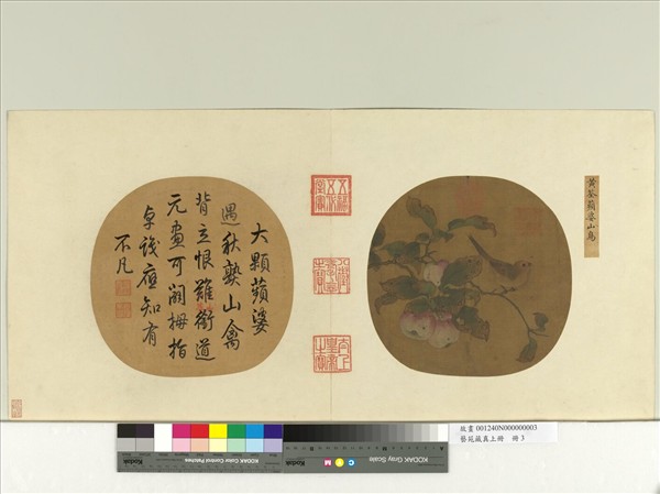 粉紅鸚嘴飛上枝頭,輕盈活潑的神情及紅熟的蘋果,營造出畫面完滿豐富的生意。畫葉翻轉生動自然,畫家用赭墨點染黃,圈出果葉上枯蝕小洞。舊傳為黃筌(約西元九0三-九六五年)所作,然依畫風而論,則較近於南宋院體畫。此圖與北京故宮所藏宋林椿(活動於西元一一七四-一一八九年)「果熟來禽」構圖雷同,反映出宋代冊頁「一式多本」的現象。