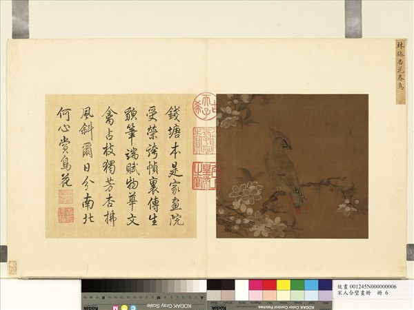 原籤題「林椿杏花春鳥」,畫又名太平鳥的朱連雀立杏花枝頭,回首與觀賞者呼應。   本幅枝幹筆法接近林椿「山(木茶)霽雪」,惟轉折提頓較明顯,技法上更顯純熟。用色層層填染,具「山(木茶)霽雪」韻味。花朵白粉分染處理,與推斷為馬麟(約1180-1256後)所作之宋人「桃花」相類,然「桃花」枝幹更見自然感。林椿、馬麟的活動時期在先後間,「杏花春鳥」則或是略晚於馬麟之典型精緻南宋院畫作品。(20101015)