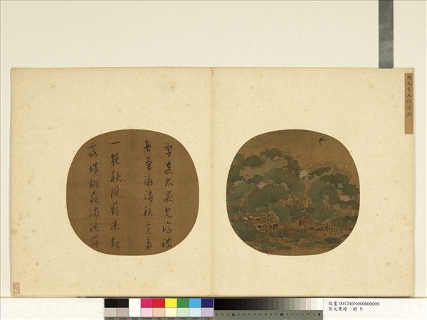 馮大有(西元十二世紀),江蘇蘇州人。自號怡齋,官至承事郎。七歲能文,善畫蓮,寫陰睛風雨各態,極能傳神。本幅選自「宋元集繪」冊第九幅。滿塘荷葉,偃仰傾側,風姿萬千,伴以紅白芙蕖,浮萍點點,群鴨悠游覓食,蝶燕蹁躚飛舞,益顯一派炎夏荷風滿塘,生意勃發的景象。畫名太液,語出﹝史記封禪書﹞。按漢武帝於太液池南築建章宮,復於池中建台,至昭帝時,嘗有黃鵠飛入池中,群臣以為瑞兆。大有此幀紈扇荷花,布局賦彩典雅,且蝶鳧成雙,顯然隱含祥瑞之意。