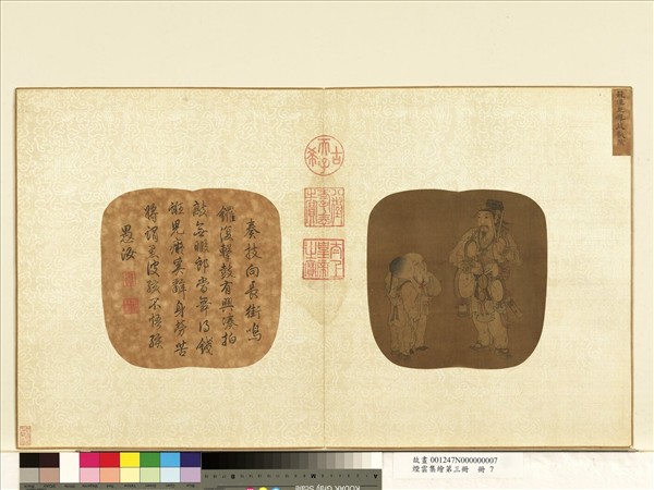 街頭賣藝郎披掛琳琅滿目的道具,施展他巧妙的技藝,鳴鑼擊鼓,並和著節拍,引來了兒童駐足圍觀。本幅為「煙雲集繪」第三冊中的一幅,無款印,屬蘇漢臣一路之畫風。 蘇漢臣(約西元十二世紀),河南開封人。曾任宣和畫院待詔,北宋亡於金後,南宋紹興年間又進畫院復職,師劉宗古,工畫道釋、人物臻妙,尤善嬰孩。