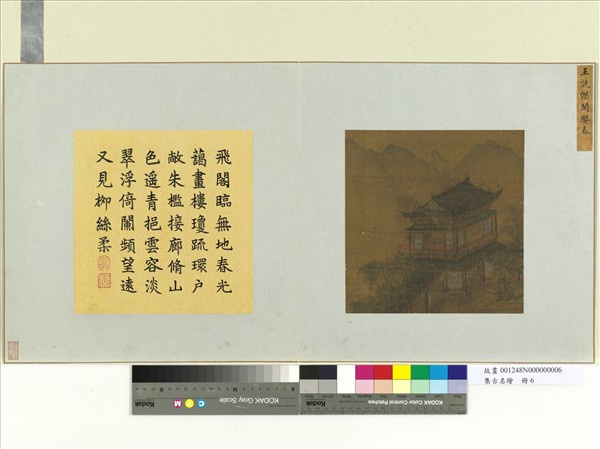山樓一角,樓上兩婦人憑欄遠眺,樓下廊中一婦女前行,雛鬟隨後。畫人結體瘦長。屋宇用界及樹石用筆與景德四圖卷有相通處,疑是北宋時作品,無款印,原籤標王詵傑閣媐春。 本幅選自「集古名繪」第六開。