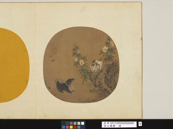 本幅為「宋人集繪」冊之一開。繪小犬嬉戲花貓於庭苑間,山石旁秋葵盛開,雙蝶翩然起舞。用筆細緻而佳趣活現,染繪皆極清奇婉麗。 畫幅右下石間有「李迪」之款,然筆調風貌已晚,疑是後人仿作。按李迪(活動於西元12世紀),河南孟縣人。北宋宣和時任職畫院,授成忠郎,至南紹興年間再復職,為書院副使,賜金帶。工畫花鳥、走獸、竹石。