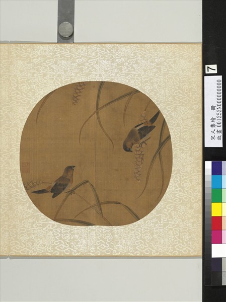 本幅畫秋日田間野趣。幅中有斑文鳥二,一立於穀穗上正欲俯身啄食,尾部略為上翹,一立於莖上,仰首上視。描繪栩栩如生,畫鳥身上之斑紋用筆極為工細,穀穗先用藤黃染出淺深,上點白粉,再以尖細之筆畫芒,畫穗草行筆較緩,先用老綠漬染,半淺半深,尾端略呈焦黃處則施以赭色,筆墨設色雖簡,卻極盡形容。 本幅為「宋人集繪」冊第七開。