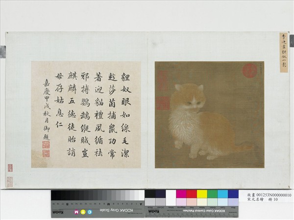 李迪(活動於西元1162─1224年),河南孟縣人。北宋宣和時任職畫院,授成忠郎,南渡後於紹興年間再復職,為畫院副使,賜金帶。工畫花鳥、走獸、竹石,有生意而具佳趣。本幅繪小貓踞坐探爪,狀甚可愛。染繪斑紋,白粉勾畫頗具功夫。畫幅右上角有「甲午歲李迪筆」之款,其下方則有塊長方形之接痕,該處或原有款印,被割去而重新填補者。 本幅選自「宋元名繪」冊第十幅。