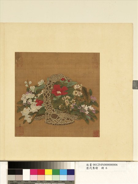 李嵩(約活動於1190-1264),浙江錢塘人。少時曾為木工,後被宋徽宗(1101-1126在位)宣和年間畫院待詔李從順收為養子。歷任南宋光、寧、理宗朝畫院待詔,人物、山水界畫、花卉皆長。 編織精緻的籐籃中盛滿紅山茶、白水仙、綠萼梅、丁香與瑞香等花卉,象徵年節喜氣祥瑞之意。圖繪花葉反轉向背,自然寫實,採雙鉤填彩法,色澤典雅富麗,為典型南宋院體畫風。圖上有李嵩名款,及明代收藏家沐璘(1430-1458)及項元汴(1525-1590)幾方收藏印。 十二、十三世紀時杭州附近,已有專業的園藝事業,名詩人陸游(1125-1210)有詩:「小樓昨夜聽春雨,深巷明朝賣杏花。」這一籃花雖然沒有杏花,但嫣紅姹紫的氣氛,足以反映當時宋朝愛插花的情形。(林莉娜)