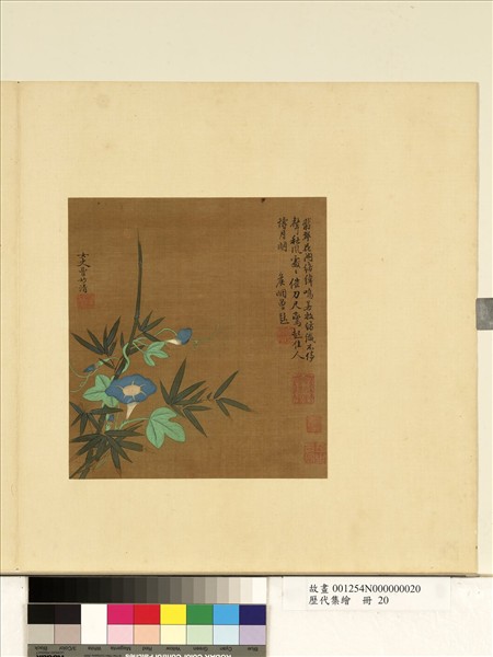 曹妙清,元末明初女畫家,錢塘(今杭州)人。字比玉,號雪齋。善鼓琴,工詩書畫。 本幅選自<歷代集繪冊>,絹本重彩,小景邊角構圖,畫牽牛花緣竹枝蔓生。自古青綠多施於山水,此件獨應用於花卉。以白粉、石青模擬牽牛花介於藍、紫之間的微妙花色;並以明亮的石綠著牽牛藤葉,和竹葉深綠形成對比,又以石青點染竹葉亮處,呼應花瓣色澤。全幅佈景設色甚精緻,為閨閣畫家慧心巧藝代表作。(20110102)