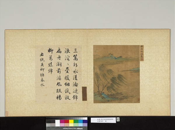 仇英(約西元一四九四-一五五二年),字實父,號十洲,江蘇太倉人。曾作漆工,後遇周臣,經其指授,漸有名於藝壇。工畫山水、人物,並擅花鳥、禽獸,為明四大家之一。   本幅為青綠設色,繪江岸遠山,近景坡陀上楊柳二株,柳葉垂曳飄舞,若有輕風徐拂。岸邊篷舟中主僕二人,狀似領受明媚的山光水色。全幅筆墨精澹,畫風極其娟秀。本幅選自「名畫薈珍」冊第六開。