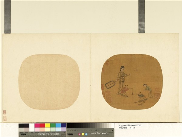 五月五日慶端午, 菖蒲石榴來應景, 手搖蒲扇除溽暑。 童子戲蛤蟆, 蛤蟆國國叫, 好奇保保哈哈笑。   紅衣童子手提棍綁蟾蜍,逗弄藍衣童子。兩旁各有一婦女,地上則有菖蒲、石榴等端陽時節應景物。畫中人物講究此間呼應,兩童子一引一趨,體態位置,頗富動感。婦女姿態優美,端莊嫻靜。