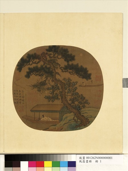 近岸一株青松,高高地斜矗著,將畫面分成遠近兩部份,藤花纏繞松幹,松旁一株春樹,正杼放著朵朵的花香。松下一船,靠著岸邊,船中高士以手為枕,若有所傾聽。遠方一小舟,漁夫正敲著趕漁的樂器。畫家以細心的筆調,畫山整潔的畫面。左下角題尤能傳達畫意。詩云:「春月輝輝白,春花冉冉香,夜深船倚岸,何處尚鳴榔。」