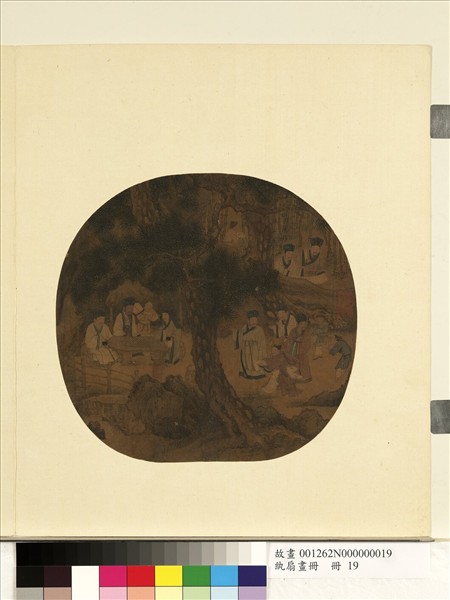 設色畫。巨松一株,使畫面中分為二。幅右二人對奕,一人坐觀,童子持扇侍立。幅左六人,一人戴花舞踊,三人且行且語,二童子隨之;二人在坡石後,共持一卷,童子捧卷自竹間來。是幅畫香山九老故事,﹝新唐書﹞白居易傳:「(居易)東都所居履道里,疏沼種樹,構石樓香山,鑿八節灘,自號醉吟先生,為之傳。……嘗與胡杲、吉旼、鄭據、劉真、盧真、張渾、狄兼謨、盧貞燕集,皆高年不事者,人慕之,繪為九老圖」。本幅無款印,觀其畫風近似劉松年。是幅選自「紈扇畫冊」第十九幅。