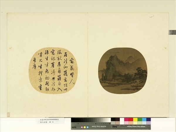燕肅(西元九九一至一○四○年),先本薊(河北)人,遷於陽翟(河南禹縣)。文學治行,縉紳推之。其胸次瀟灑,每寄心於繪事,尤喜畫山水寒林。 本幅繪溪流環繞,中有平岸,沿溪植松竹桃李,竹叢深處,矮屋三間,兩人憑軒對坐。屋左石壁拔地而起,自山左而來,小徑盡頭,遠樹數筆。筆墨間與人一種寧謐悠遠之趣,味之不盡。筆法略似李唐。原屬於「歷代名繪」冊第十一開。