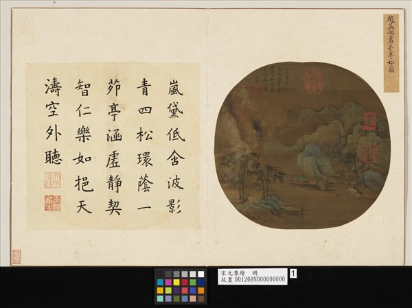 趙孟頫(西元一二五四-一三二二年),浙江吳興人,字子昂,號松雪道人。本宋宗室,宋亡仕元,至翰林學士承旨,封魏國公,諡文敏。 本幅松樹及巖石的造形出於李成、郭熙一系。山峰重於勾輪廓,而少皴筆。敷色先以赭石打底,再分別由峰頂以石青、石綠罩染。青綠與赭色的搭配,顯得沉厚中有一份古雅,襯托出萬般俱靜,但聞松籟,所謂天人合一的氣氛。
