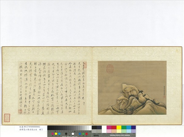 王翬(西元一六三二-一七一七年)字石谷,號耕煙散人,又號烏目山人、劍門樵客。江蘇常熟人。山水得王時敏指授,為清初四大家之一。 深山積雪,古松樓閣。景物集於下方呈金字塔狀,餘為遼闊天空。主峰突起,畫平台崖壁染赭色,餘山石用披麻皴法,筆法柔雋;山頭樹梢微點白粉,松及遠樹用重墨畫染石綠。畫家以青綠設色表現出冬日深山小雪的景致。