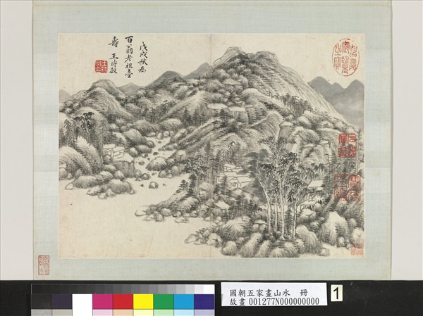 王時敏(西元一五九二-一六八0年),江蘇太倉人。字遜之,號煙客,自號西廬老人,西田主人,偶諧道人,歸村老農。性資穎異,淹雅博物,畫為清四大家之一。 崗巒起伏,林木森深,水閣幽寂、隱於林間。本幅用淡墨濕筆皴染,復用焦墨乾擦點苔,蕭間清遠之趣,出於筆墨蹊徑之外。本幅選自「國朝五家畫山水」冊。