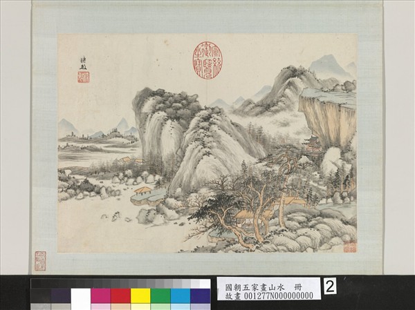王時敏(西元一五九二-一六八○年),江蘇太倉人。字遜之,號煙客,又號西廬老人、西田主人、偶諧道人、歸村老農。詩文書畫俱佳,而於山水特有體會。少時曾與董其昌、陳繼儒共研理,多受啟發;且家富收藏,故下筆輒見古人根底,終爾被推為清初六大家之首。 江畔林間,茅屋數椽,一翁獨坐。其後峰巒聳立、下有平臺幽亭,遠方披陀河水,得淡遠之妙。山石用披麻皴法,層層皴染,蘊藉渾厚。本幅選自「國朝五家畫山水」冊。