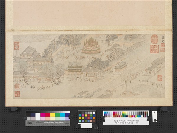 吳彬,萬曆(一五七三-一六一九)間,以書畫聞名於世。福建莆田人,流寓金陵(今南京)。字文仲,所繪人物,形狀奇特,不同於前人,自成一家。山水畫布置亦極新奇而不摹古。   本幅畫元宵夜景,城池市街,盛張燈彩。星橋火樹,遊人如織。一片元夜觀樂之情。河中倒映月影,城根籠罩薄煙,寫寒夜而極具匠心。