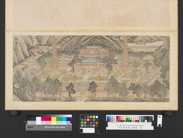 吳彬,活動於明萬曆十九年(一五九一)至崇禎十六年間(一六四三),福建莆田人,流寓南京,後以善畫,被召為中書舍人,深獲神宗賞賜。曾遠遊西蜀,目睹劍門、峨嵋、岷山諸大山川之雄奇。中晚期以後山水畫多以誇張和變形的手法,強調山巒峻削雄偉之感。   本冊共十二幅,描繪各月份的節慶活動。本次選展二幅:「結夏」以界畫樓閣庭院,曲橋荷塘,作斜向構圖,人物畫法一致,但各具情態。「浴佛」畫寺廟依山傍水而築,與自然環境融揉一片。兩幅描繪俱精緻而饒古趣。
