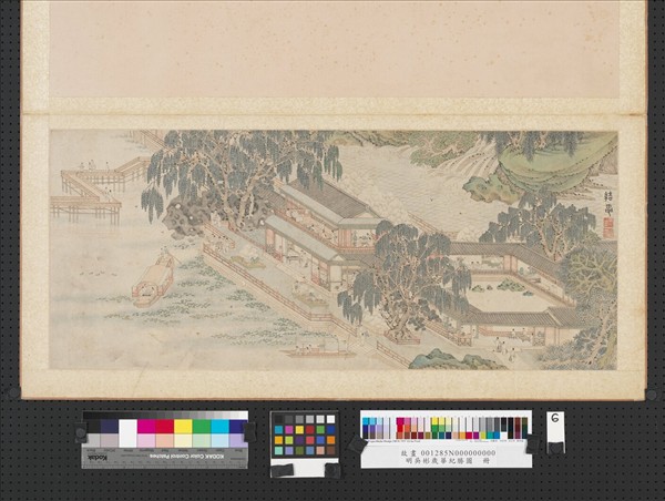 吳彬,萬曆間(西元一五七三至一六一九年)以書畫聞名於世。福建莆田人,流寓金陵(今南京)。字文仲(文中),所繪佛像人物,形狀奇特,不同於前人而能自立門戶。山水畫布置亦極別緻,不泥古,頗為新奇。   荷塘清暑,綠柳濃蔭,士人仕女及時行樂,清暑於水軒樓閣間。或曲橋漫步,或棹舫清遊,或採蓮水上。案桌上供瓜果瓶荷彝鼎,水上清風徐來,暗香撲面。清夏水鄉,彌多樂事。   本幅為歲華紀勝冊第六開。