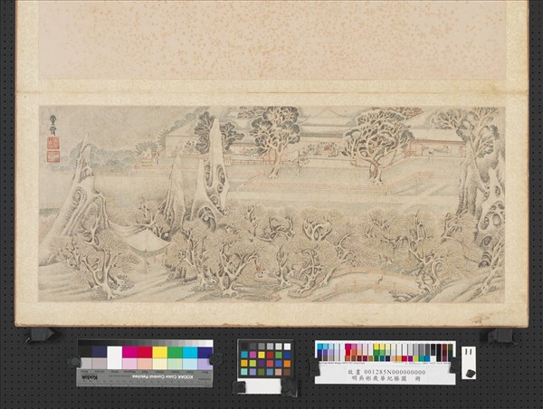 此冊描寫一年十二勝景,於篆書標題下皆有吳彬鈐印。後期展出中元、玩月、登高、閱操、賞雪、大儺等六幅。畫中景物細膩生動,山林造型奇特、設色淡雅,顯出纖麗巧態。以時序活動為主題,構景多描繪江南景觀。如登高景中有山形奇特,學者推測為南京近郊牛首山。而無論是玩月、登高、閱操、賞月,皆能與明人生活逸事呼應,全冊兼具月令歲時與佳景記勝特色。 (20121018)