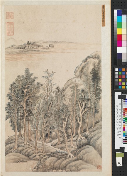 王翬(西元一六三二-一七一七年),江蘇常熟人。字石谷,號耕煙散人。畫山水先後得王鑑、王時敏指授,對古畫之鑑賞及臨摹均極見功力,畫技之精熟被譽為清代第一,與王時敏、王鑑、王原祁合稱「四王」。 本冊共十二幅,分別仿自宋元名家,此次選展三幅,籤題各為「董北苑夏木垂陰」、「李營丘雪圖」、「許道寧喬林暮靄」,畫法俱不相同,可據以體會三家之風格特質。 (20121016)