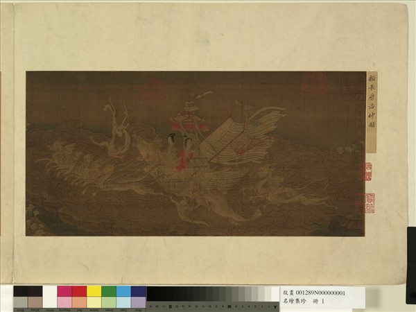 此畫三國魏曹植的名作〈洛神賦〉的一段,描寫洛川之神宓妃駕六龍乘雲車,「文魚警乘,玉鸞偕游,鯨鯢夾轂,水禽翔衛」,旌旗飛揚的景象。刻畫精細,流水、卷雲、小樹及河岸的畫法,存有早期山水畫的稚拙之趣。選自「名繪集珍」。 畫無作者名款,舊傳顧愷之長於人物畫,以線條精細優美著稱。