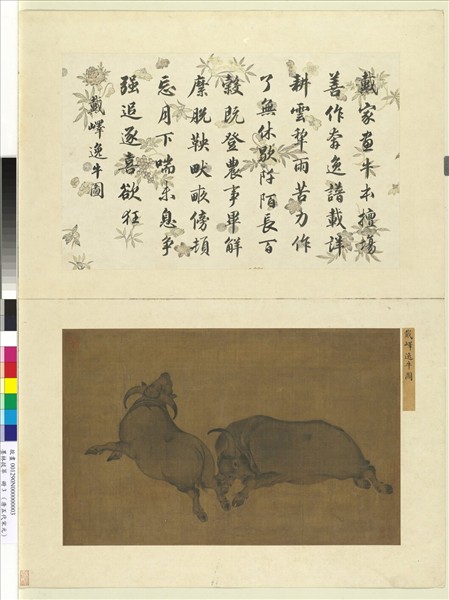 戴嶧(約西元八世紀)是戴嵩的弟弟,兄弟皆以畫牛而聞名。嶧特別喜歡描繪水牛飛馳奔走的野態。 「宣和畫譜」著錄,戴嶧畫牛中,有逸牛圖、鬥牛圖、奔牛圖數種。這張畫上,共畫牛兩頭。一頭牛用角觝觸,另一條牛卻旋轉著身子,好像雖敗而欲再迎戰的樣子。也許題名作鬥牛圖比較妥當。圖上有式古堂諸收藏印,是經過卞令之收藏過的。