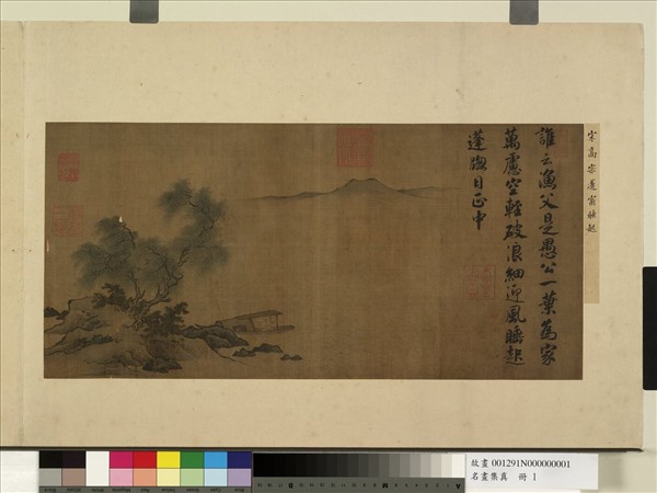 此幅畫柳岸篷舟,水波粼粼,遠山逶迤,初睡起的漁父欠臂伸腰,望向右方空闊處,予人渺無垠際之感。右幅空處題漁父詞一則,描寫漁父悠游自在之景,詞意與畫意契合無間。書末有宋孝宗(1127-1194)退位後鈐蓋於書作之「壽皇書寶」印,從書法風格來看,可推知出於孝宗。 此書圓潤豐腴,捺筆厚重,線條提按、粗細,變化有致,牽絲引帶,輕盈流動,與高宗書風相近,都是從王羲之行書蛻變而來。(20101015)