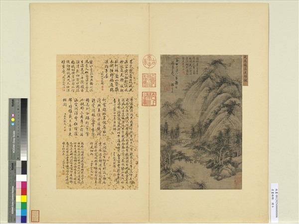 吳鎮(西元一二八○至一三五四年)嘉興魏塘人。字仲圭,號梅花道人,又嘗自署梅沙彌。博學多聞,藐薄榮利。畫師巨然而能自闢畦逕。 此幅成於至正二年(西元一三四二年),先生六十三歲作。小溪回曲,林蔭深濃。筆蒼勁而渾,墨層沓而清。蓋以紙膚駁蝕,特覺別有一種古趣。本幅選自「名畫琳瑯」冊。