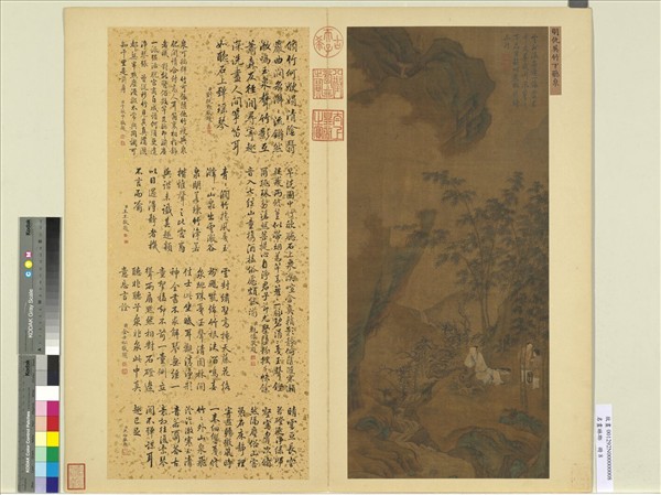 仇英(約西元一四九四至一五五二年)作品見於正德己巳至嘉靖壬子間,垂四十餘年。太倉人,字實父,號十洲。曾作漆工,其師周臣異而教之,後遂成名。畫精麗秀勁,為明四大家之一。 畫無款印,當出鑒藏者所定。竹樹雙鉤,人物俊秀。澗水用筆極生動,而清流遠引,曲折玲瓏,皆仇畫之出色當行者也。本幅選自「名畫琳瑯」冊。