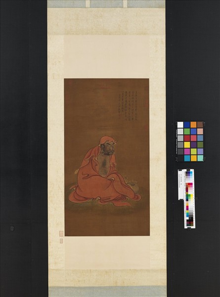 達摩本名菩提多羅,梁普通元年(西元五二O)由海路來廣州。不久,梁武帝便迎接他到建業(今南京)去講道。因梁武帝不能悟道,而渡江到北魏,停留在嵩山少林寺,整日面壁修道。後來慧可跟他學法,於是將衣缽傳授給慧可。於梁大通二年(西元五三O)圓寂。 這一幅畫達摩盤膝坐在草上,雙眼凝神,好像已經入定。身上披著紅袍,袍上用泥金鈎畫裝飾圖紋,顯得莊嚴古艷。