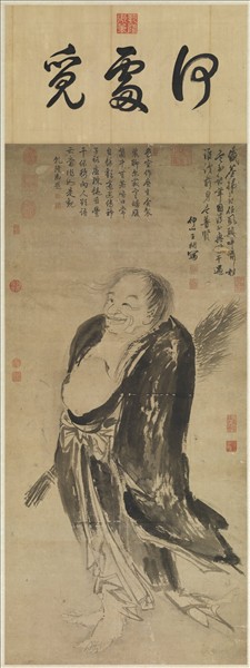 王問(西元一四九七-一五七六年),江西無錫人。字子裕,號仲山,嘉靖壬辰(一五三二)進士。拾得是唐朝時能作詩的和尚。他的老師豐干禪師走在赤城的道路上,聽到被遺棄小嬰兒的哭聲,就撿拾教養他,因此名叫「拾得」。拾得與另一位高僧寒山齊名。這一幅畫,以狂放的筆調,大肆揮灑畫出,頃刻之間,就畫完成,這是大寫意的畫法,對於表現拾得瘋瘋顛顛的形象,真有傳神之妙。