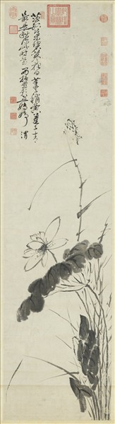 徐渭(西元一五二一-一五九三),山陰人,字文長,號天池,又號青藤道人。性情好奇,曾簽名曰田水月。工詩善古文辭。書法寫得好,行草尤為人所推崇。中年學畫花卉。用筆瀟灑,天才橫溢。人物極其生動。山水不拘規矩。自己認為書第一,詩第二,文章第三,畫第四,學者們都表贊同。   這幅墨荷,筆墨很好。詩中自題:「茨菰葉碧蓼花白,菱子稍黃蓮子青。最是秋深此時節,西施照影立娉婷。」書畫相輝映。